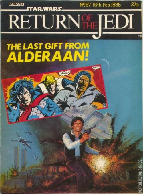 Return of the Jedi Weekly 87 is the eighty-seventh issue of Return of the Jedi Weekly, the continuation of the Marvel Star Wars UK series. This issue reprints part four of a story printed in the US as Star Wars 92: The Dream, along with part one of Star Wars 53: The Last Gift From Alderaan!.