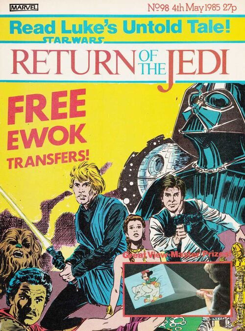 Return of the Jedi Weekly 98 is the ninety-eighth issue of Return of the Jedi Weekly, the continuation of the Marvel Star Wars UK series. This issue reprints part three of the story printed in the US as Star Wars 17: Crucible, along with part three of Star Wars 56: Coffin in the Clouds.