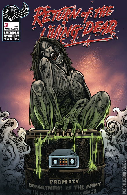 The Melted Chick is here in all her gory glory! She wants brains! This is the exclusive limited edition American Mythology Monster variant issue. Limited to only 350 copies it's rarer than a vat of Trioxin! Allocations likely to occur. Listen up, undead-heads! Return of the Living Dead is back and bolder than ever in this brain-chomping, Trioxin-flavored, run-for-your-lives comic book series serving up another dose of dark horror comedy for the hungry masses! The two groups of survivors fight their way through an amusement park full of brain craving zombies, knowing that the only way to survive is to join forces. That won't stop the Melted Chick and her minions from getting their final revenge as the undead inhabitants of the park continue to rise and join the ranks of the growing army of corpses. And just when the night seems at its darkest, a surprise savoir comes forward with one last hope of getting off the island before they all become a feast for the undead hordes! Get Bitten by Return of the Living Dead issue 3!
