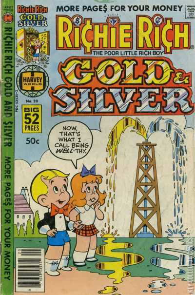 Richie Rich and the Sea Gold Pirates"; As Dr. Kindan is demonstrating a machine that distills gold from sea water, pirates steal the gold, but Richie and the scientist pursue them underwater. Untitled one-page story; Richie follows Gloria's instructions in giving her an inexpensive gift, but also arranges for an orchestra to perform for her as she receives it. "Pirate City"; Richie and Dr. Kindan pursue the pirates to their island base, where they are captured and imprisoned. "Force One"; Mr. Rich's fighter pilots open fire on the pirate fleet, but the pirates are holding Richie and Dr. Kindan on the lead ship. "Acting Material"; Richie tries to help Lotta in her aspirations to be an actress. "The Get Well Machine"; Richie plays around with a machine that can instantly heal any ailment. "Oh, My Achin' Back!"; Lotta does what she can to ease her grandpa's bad back. Untitled story; Lotta imagines herself as a pioneer housewife. "A Lotta Dot"; Dot seeks Lotta's help in dealing with a bully. 52 pgs., full color. Cover price $0.50.