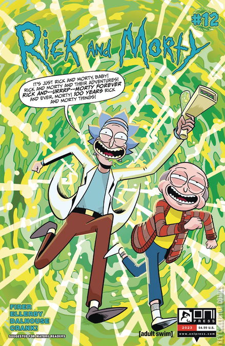 FINAL ISSUE!!! (OR IS IT?!?!) The whole of the Rick and Morty™ omniverse teeters on the brink of a terrifying precipice! The battle between math and science, the gods and stinky man, comes to a head as Rick, Nunzumel, and the Goldenfolds fight over a dead planet with the only remaining space milkshake. But Morty and Noelle have stolen the last working ship and have left for Earth to be together, leaving Rick and his ego to fend for himself.