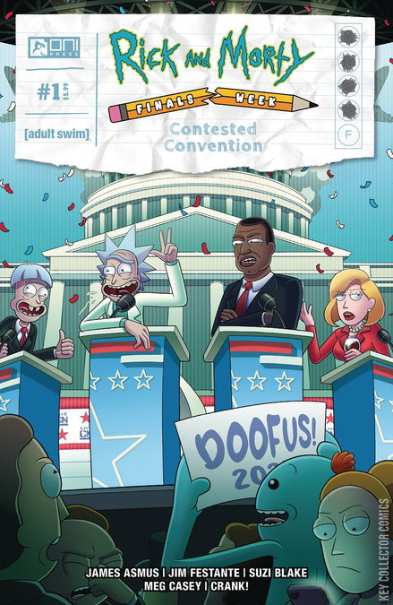 From writers James Asmus and Jim Festante (Rick and Morty Super Spring Break Special, Survival Street) and rising star illustrator Suzi Blake—another day, another final! As Morty’s poli-sci exam approaches, he persuades Rick to portal him to President Curtis for some much-needed extra credit. With Curtis is on his way to secure his party’s presidential nomination, and Rick determined to prove even the dumbest version of him could beat Curtis, Doofus Rick’s hat is thrown in the ring! Competition heats up when Doofus announces Jerry as his VP, and Beth joins the race to become the first woman president. It’s gonna be one contested convention!