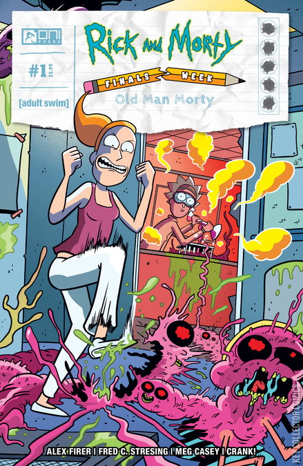 It’s the FINAL DAY of FINALS WEEK! Does the survival of the Omniverse ride on a passing grade? Only OLD MAN MORTY knows! Morty is at his wits’ end. He’s failed his last four exams and is desperate for a miracle. As he begs Rick for help, they’re paid an unexpected visit by . . . MORTY?! No, OLD MAN MORTY, who takes his younger self on a journey, much to Rick’s chagrin, as something just doesn’t feel right . . . The final chapter of the sad, hilarious Finals Week saga, written by Rick’s New Hat scribe Alex Firer, and drawn by Rick and Morty veteran Fred C. Stresing. This tale promises to entertain, if not inspire you to make better choices in your life!