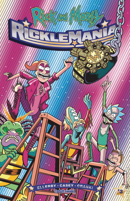 From Marc Ellerby (Doctor Who), the piledriving action of Rick and Morty: Ricklemania continues as we reach the penultimate issue-and the stakes couldn't be higher! While young, frail, pathetic Morty trains with his mom and Space Beth, Rick and Summer continue to take the Intergalactic Wrestling Federation by storm-but things are not as tight as they seem with the high-octane duo. As Summer's in-ring antics boost her popularity, bitter resentment and jealousy begins to brew inside Rick. Consumed by wrestling, popularity, and all the merchandise that comes with it, Rick starts his own bad boy, pickle-based wrestling faction and begins turning on his own friends and family! Oh no!