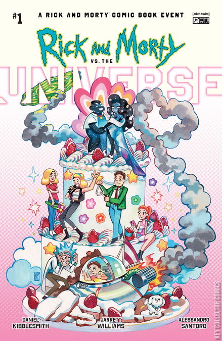 MOVE OVER, BIG BANG! GET WRECKED, BIG CRUNCH! GALAXIES COME AND GALAXIES GO, BUT OUR PLANE OF EXISTENCE HAS NEVER FACED ANYTHING AS CONSEQUENTIAL AS . . . THE FIRST-EVER RICK AND MORTY COMICS EVENT! From the deviant psyches of comics mastermind and multiple Emmy Award–nominee Daniel Kibblesmith (Loki) and artistic annihilator Jarrett Williams (Speed Force), this summer’s seven-part countdown to the end of everything that was, is, and will be begins with . . . a bachelor party that gets a little out of hand? Rick’s old buddy Dimension C-137 (where Rick and Morty Cronenberg’d Earth) has reached his UNIVERSAL HALF-LIFE and is getting MARRIED—to the female-presenting embodiment of the Parmesan Dimension! He’s found true love and wants his old pal Rick to plan his bachelor party! WHAT COULD GO WRONG? Answer: Pretty much everything . . . and it is all Rick’s fault! Now Rick and Morty are on the run from EVERY SINGLE UNIVERSE THEY’VE EVER MESSED WITH—meaning, no matter what dimension they escape to, the universe will literally be against them. And, to survive, Rick will be forced to something he hoped he would never have to do—a last resort of EPIC PROPORTIONS! DON’T CALL IT A CRISIS! The FIRST RICK AND MORTY COMICS EVENT starts here with a cosmos-colliding spectacular TOO BIG FOR TV . . . and featuring, well, EVERYONE!