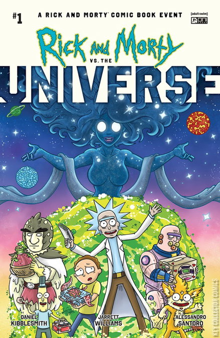 MOVE OVER, BIG BANG! GET WRECKED, BIG CRUNCH! GALAXIES COME AND GALAXIES GO, BUT OUR PLANE OF EXISTENCE HAS NEVER FACED ANYTHING AS CONSEQUENTIAL AS . . . THE FIRST-EVER RICK AND MORTY COMICS EVENT! From the deviant psyches of comics mastermind and multiple Emmy Award–nominee Daniel Kibblesmith (Loki) and artistic annihilator Jarrett Williams (Speed Force), this summer’s seven-part countdown to the end of everything that was, is, and will be begins with . . . a bachelor party that gets a little out of hand? Rick’s old buddy Dimension C-137 (where Rick and Morty Cronenberg’d Earth) has reached his UNIVERSAL HALF-LIFE and is getting MARRIED—to the female-presenting embodiment of the Parmesan Dimension! He’s found true love and wants his old pal Rick to plan his bachelor party! WHAT COULD GO WRONG? Answer: Pretty much everything . . . and it is all Rick’s fault! Now Rick and Morty are on the run from EVERY SINGLE UNIVERSE THEY’VE EVER MESSED WITH—meaning, no matter what dimension they escape to, the universe will literally be against them. And, to survive, Rick will be forced to something he hoped he would never have to do—a last resort of EPIC PROPORTIONS! DON’T CALL IT A CRISIS! The FIRST RICK AND MORTY COMICS EVENT starts here with a cosmos-colliding spectacular TOO BIG FOR TV . . . and featuring, well, EVERYONE!