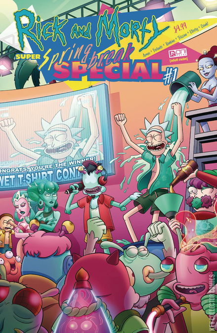 IT'S SPRING BREAK, FOR RICK'S SAKE! Slap on a Speedo and slather on that suntan lotion, because the omniverse's most dysfunctional uncle/ nephew combo is about to catch an unhealthy dose of extra-solar radiation in an absolutely gargantuan, absurdly overstuffed 64-PAGE GIANT! Aw yeah, spring break! Rick, Summer, and Morty have ventured offworld to a planet where young, sexy vacationers from around the universe come to party, cut loose, and compete in the annual Spring Break contest! While Summer has just enough self-respect to avoid vying for Ms. Spring Break, Rick doesn’t! And he’s all in on winning Mr. Spring Break. But little do our heroes know that winning the Spring Break competition comes with a steep “reward,” and if the winner refuses the reward, well, it may just unleash a swift and vicious class war between the exploited and exasperated locals and the pampered and unprepared spring breakers.