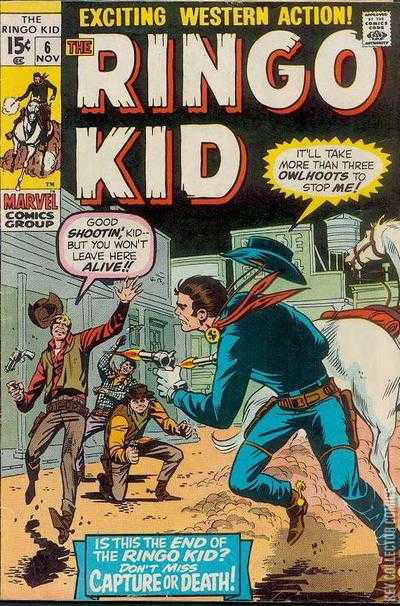 Home / Marvel / Ringo Kid / Ringo Kid #6 Marvel Released November 1970 Ringo Kid #6 Add to Collection Want It Synopsis No synopsis available. Issue 6 of 30 Add to Collection Buy it on eBay Buy on eBay Low $5 Mid $15 High $45 Synopsis No synopsis available. Details Series Ringo Kid Cover Date November 1970 Pages N/A UPC N/A Cover Price N/A Final Order Cutoff N/A Creators Artist Herb Trimpe Price Guide Log in or subscribe to access detailed graded price information and market insights. Log In Subscribe