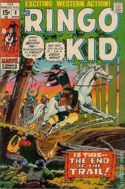 Home / Marvel / Ringo Kid / Ringo Kid #8 Marvel Released March 1971 Ringo Kid #8 Add to Collection Want It Synopsis No synopsis available. Issue 8 of 30 Add to Collection Buy it on eBay Buy on eBay Low $1 Mid $5 High $15 Synopsis No synopsis available. Details Series Ringo Kid Cover Date March 1971 Pages N/A UPC N/A Cover Price N/A Final Order Cutoff N/A Creators Artist Herb Trimpe Price Guide Log in or subscribe to access detailed graded price information and market insights. Log In Subscribe