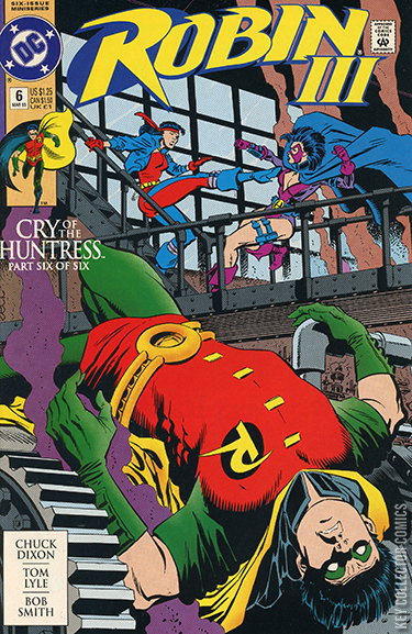 MURDER INK Suddenly faced with trying to get an innocent girl out of a processing plant full of thugs, Robin goes to work on taking them out, using the fact that he shut the lights off earlier and his night-vision lenses to his advantage. Unfortunately, when the lights come back on, he is temporarily blinded. Even so, he manages to take out many of the thugs, grab Ariana Dzerchenko, and make their way into the hallway. Unfortunately, Ariana has been drugged, and Robin is forced to leave her alone while he attempts to rescue Huntress from the KGBeast. The Hammer's commissar attempts to extract information from a bound Huntress, but she is not forthcoming, even under the KGBeast's torture. Knowing he has little chance against the Beast, Robin attacks anyway, hoping to buy Huntress some time. She makes good on the chance, using her unbound feet to kick the commissar to the ground while KGBeast is distracted. Finally, Robin tosses a Batarang, cutting the rope holding her. He drops some smoke bombs, and the two of them escape up an elevator shaft. Despite that, Robin explains that they still must save Ariana. Meanwhile, the Ghost Dragons begin laying siege to the printing plant. While they kill many of the Hammer's thugs, KGBeast remains, and nearly kills their leader Lynx. Fortunately for her, King Snake arrives, and engages with the Beast. This gives the opportunity for Lynx to shoot at the commissar, who falls into a printing press, which shorts out the power in the building. The darkness offers the blind King Snake an advantage. In the darkness, Huntress, Robin, and Ariana attempt to sneak out, but they are accosted by Lynx. Robin risks his life to knock Lynx out and catch up to the Huntress. After defeating KGBeast, the King Snake attempts to take the printed money for himself, but is interrupted by Huntress, who threatens to burn all of the currency with a flamethrower. However, Robin offers a proposition. They will allow King Snake to keep the counterfeit bills if he will let them and the Hammer's prisoners go. Knowing that he will have another chance to kill Robin, King Snake agrees. Before they go, King Snake reveals that the counterfeit currency is actually the Eurodollar, a currency for the European commonwealth that will not enter circulation for years, meaning it is not yet valuable. As they drive off, Robin reveals that he had already changed the encoding on the money's data strip such that it wouldn't be accepted as legitimate currency. Tim finally returns home to Drake Manor, where his father Jack waits. Before he can explain himself, his father apologizes for allowing them to grow apart, and promises to cancel his plans to put Tim in boarding school. As they agree to let nothing come between them again, the Bat-Signal shines in the sky.