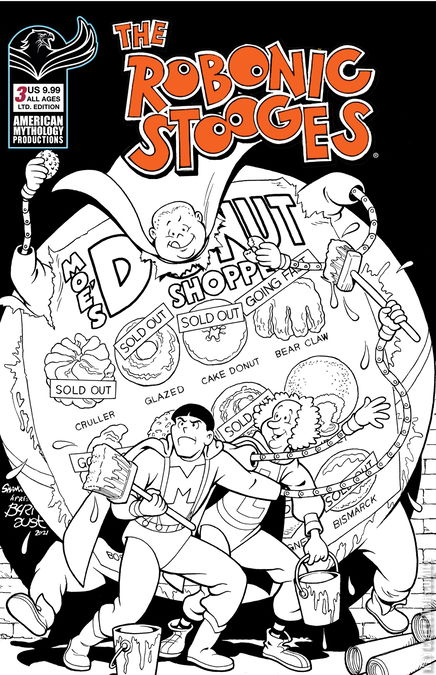 The Saturday Morning Cartoon Revival Continues! The Robonic Stooges are back and fans have responded with a resounding Nyuk Nyuk to the Nyuk! They've already saved the planet from the world-devouring Oreganose, and the subterranean terror known as MoleShemp! But now The Boys must face their greatest challenge yet when they're thrust into a pastry-fueled post-apocalyptic future filled with a threat so dark, so vile, its name is only mentioned in whispers - The Shempinels - featured in "Days of Dunderheads Past" and an added special behind the scenes training tale in "Dangerously Stupid"! The Robonic Stooges #2 Fantastic Fools is available with three covers - Main by Eric Shanower, Variant by *, and a 350 copy Limited Edition Black & White collector's variant!