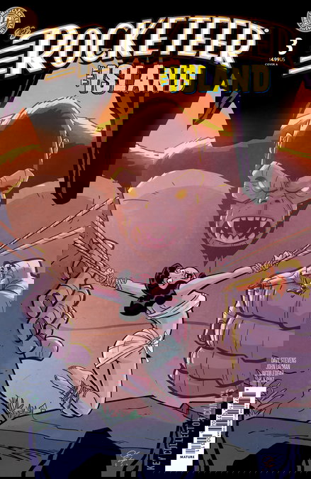 Betty’s been kidnapped for sacrifice! With his girlfriend and another crew member missing, the Rocketeer must race across the island to find and rescue them. But after running into dinosaurs along the way, he’ll need help to understand just what he’s up against. Fortunately, that help arrives in the most unexpected way. Unfortunately, it may be too late, because…Kong is coming.The Rocketeer fights his most terrifying enemy yet!