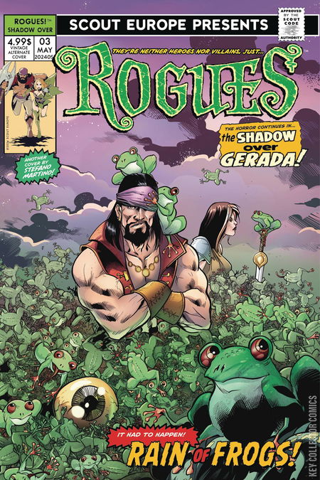 The Rogues face their most eldritch challenge yet! Bram and Weasel forge an unholy alliance with the Mouth of Elders —also called Moe—in a daring quest to retrieve the Necronomicon from the Crypt of the Gods. As Lovecraftian horrors invade Gerada, an ominous omen unfolds and the sky weeps… with a rain of frogs!