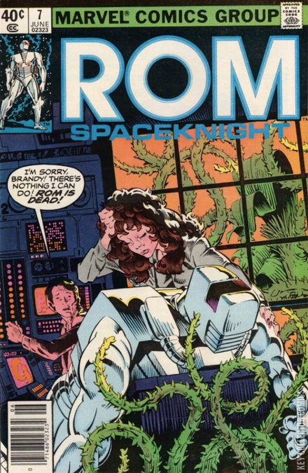 After suffering injuries in battle with the Hellhounds of the Dark Nebula, Rom falls into a coma-like state. As Steve and Brandy race against the clock to find some way to revive their friend, the Dire Wraiths, sensing Rom's weakness, press their attack. They summon the terrible Thornoids to finish their sworn enemy off once and for all.Note: This issue contains the Hostess Superhero Ad, Spider-Man in "The Trap."