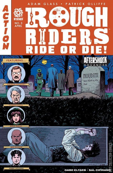 Volume Three of the hit AfterShock Series continues! In "Under the Pyramids", Harry Houdini walks on through to the other side and discovers that the Rough Riders are up against the legendary Dutch "Bokkenrijders "who have returned to this earthly plane to settle a score with one of his teammates! But Harry's truest challenge may be a visitor from his past who can spell his end...unless he listens to his newest teammate H.P. Lovecraft! Created and written by Adam Glass (executive producer of Supernatural and writer of Suicide Squad) with artwork by Patrick Olliffe (Untold Tales of Spider-Man).