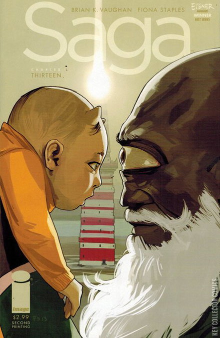 THE SMASH-HIT, CRITICALLY ACCLAIMED SERIES RETURNS! Now that you've read the first two bestselling collections of SAGA, you're all caught up and ready to jump on the ongoing train with Chapter Thirteen, beginning an all-new monthly sci-fi/fantasy adventure, as Hazel and her parents head to the planet Quietus in search of cult romance novelist D. Oswald Heist.