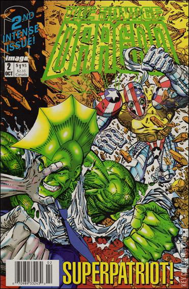 "Born Again Patriot!" Story and art by Erik Larsen. There's a new Police Officer in town. His name is Dragon, and he's using his super-human abilities to fight the mutants who terrorize the citizens of Chicago. Super-Patriot was a hero who had fallen in battle against the Vicious Circle and was left for dead. Now, more machine than man, Super-Patriot has returned. But being an officer of the law, Dragon cannot stand idly by while Patriot indiscriminately slaughters the bad guys. But does even the Dragon possess the power to stop a walking weapon of mass destruction?