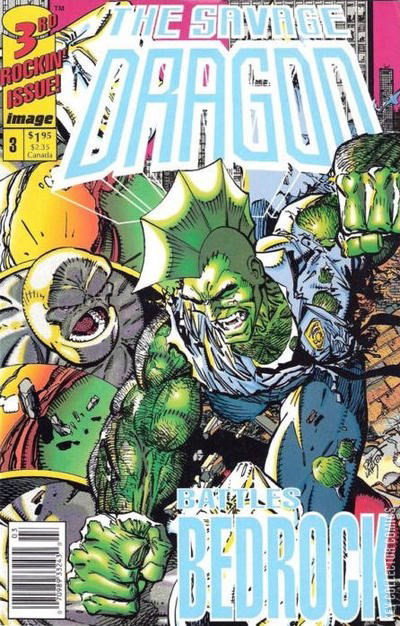 "Rock this Town!" Guest-starring Badrock. Cameos by Spawn and Shaft. 1st appearance of Nurse (who later turns out to be Mighty Man of Freak Force). Story and art by Erik Larsen. Dragon is hospitalized after his confrontation with the new Super-Patriot. It is discovered that Dragon can regenerate damaged tissue at an amazing rate (he heals real fast). But he's not on his feet for long when he's inexplicably attacked by Badrock, the Boy of Stone. Why would Youngblood's resident strong guy attack an officer of the law? The answer may shock and, at the very least, amuse you. Dragon's story continues in Savage Dragon