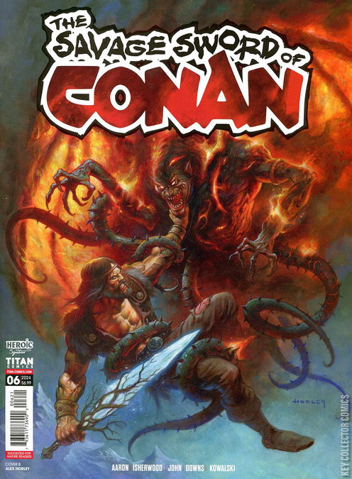THE SAVAGE SWORD OF CONAN continues its triumphant return from Heroic Signatures and Titan Comics! Featuring the conclusion of Jason Aaron and Geof Isherwood's KING CONAN epic two-part comic, a haunting DARK AGNES tale from writer Michael Downs and artist Piotr Kowalski, a chilling Conan prose story from Matthew John, titanic covers from Alex Horley and Jason Shawn Alexander, a slew of astounding art pin-ups, and more - Issue #6 closes out the first year of THE SAVAGE SWORD OF CONAN with a bloody bang!