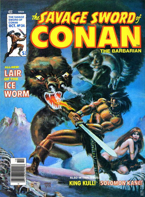 In this issue:"The Lair of the Ice Worm" a story by Lin Carter and L. Sprague de Camp adapted by Roy Thomas, Carmine Infantino and Alfredo Alcala~"A tale of Conan's youth! In the snowbound wilderness between the nothern lands and the Border Kingdom, Conan encounters an uncommon beauty - and a doom with no name!"~"The Moon of Skulls" a tale of Solomon Kane adapted by Don Glut, David Wenzel and Bill Wray"The Mirrors of Tuzun Thune" a tale of Kull adapted by Roy Thomas and Mike PloogA frontispiece pin-up by Ron Wilson and Joe Rubenstein