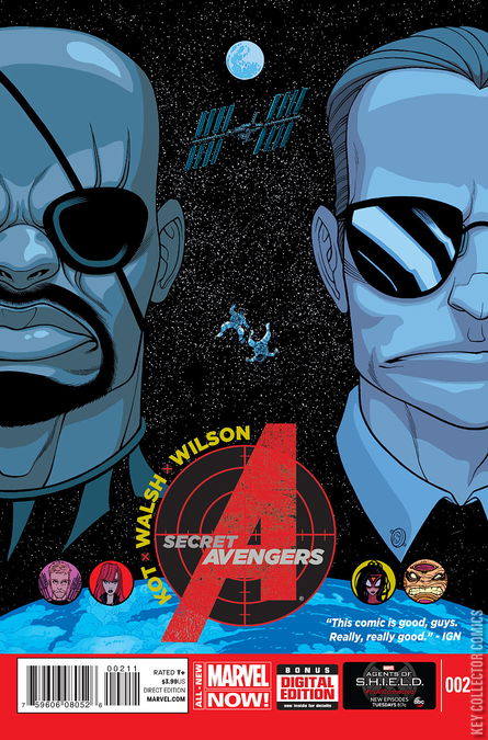 Earth is in danger. Massive decommissioned S.H.I.E.L.D. satellites are about to fall on us all. It’s a P.R. nightmare in the making! Speaking of things falling from space: Nick Fury and special agent Phil Coulson are about to die painfully. • Unless Hawkeye, Black Widow and Spider-Woman save them! Maria Hill is wounded. The hitman made it personal. Hill’s potential savior? M.O.D.O.K.!