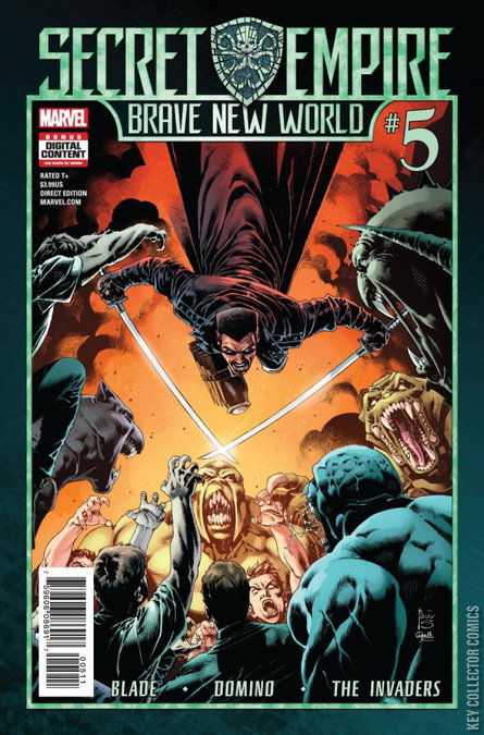 "LESSONS" / "SUPERHOT" / SANCTUARY, PART 5 With the Darkforce dome blocking all sunlight, Manhattan has a vampire problem. But the vampires are about to have a BLADE problem! As soldiers of fortune go, DOMINO’s services aren’t cheap…but when her target’s this personal, you bet this bullet’s on the house. And deep beneath the sea, the INVADERS’ struggle reaches its climax! Starring BLADE, DOMINO and the INVADERS!
