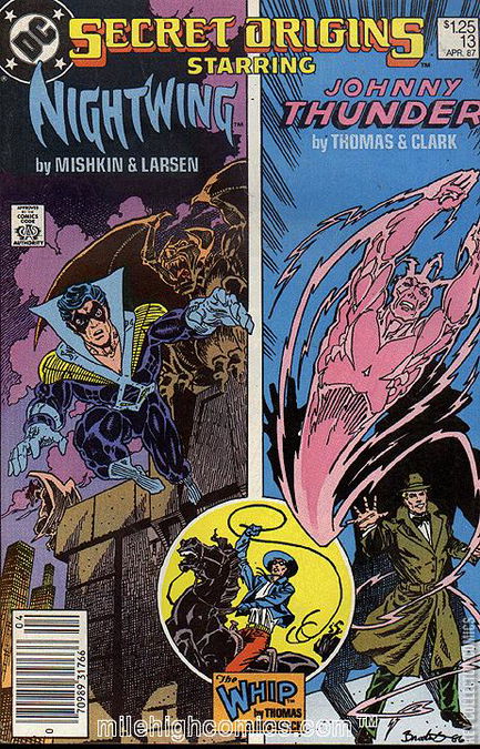 THE SECRET ORIGIN OF NIGHTWING Today is Richard Grayson's 20th birthday. He (as Nightwing) and the other Teen Titans are on the planet Okaara for Starfire's arranged marriage. Nightwing and Jericho are away from the others, with Nightwing training by trying to catch an Okaaran "monkey-bird," when Nightwing reflects on his life so far. On his fifth birthday, Dick performed on the trapeze without a net for the first time. After a successful attempt, Dick tries his parents' signature triple flip move but misses his mother's hands. He is rescued by his father. From then on, Dick performs with his family for the next five years. "Just after" his tenth birthday, his parents are killed in front of him due to the machinations of "Boss" Tony Zucco and Dick meets Batman. Dick becomes so enamored by Batman he does everything he can to be who he thought Bruce wanted him to be. He becomes Bruce's ward and trains for nearly a year, finally becoming Robin "just before" he turns eleven. Twenty-four hours after that, they're on the Zucco case where Robin takes an incriminating photo of Zucco killing a henchman which is responsible for Zucco going to prison. Over the years, though, Dick realized he was different from Bruce in many ways and began to rebel against Bruce's unspoken plans for him. That was when he helped form the first Teen Titans and began to expand outside of his partnership with Batman. The Titans disbanded when the heroes began college. When Dick went to college, his Robin career continued well but schooling was not as successful (which further split he and Bruce). He realized he didn't need or want a degree and he didn't want to continue being "Bruce Wayne, Jr." but was unsure what to do. That's when the "New" Teen Titans were formed and Robin realized that leading the team was what he truly wanted. About that time Batman brought Jason Todd in for training and Dick relinquished the Robin identity and started a new one - Nightwing. He also fell in love with Starfire who showed him how to live with (and even revel in) his emotions (something Batman did not encourage). But Starfire's political marriage has caused Nightwing to question his life and his role as leader of the Titans. Jericho reminds him of something he said earlier, "You'll never know if you can fly unless you take the risk of falling." With that, Nightwing commits himself fully to the Titans and the future. Jericho reveals that Starfire and Karras are throwing Nightwing a surprise birthday party and Jericho gives him his present - a holographic image of the Okaaran "monkey-bird" to remind him to "fly." THE SECRET ORIGIN OF THE WHIP In 1939 Polo player Rodrigo "Rodney" Gaynor happens to enter the town of Seguro, New Mexico where he learns of an expected lynching of a local man and the planned inaction of the Sheriff. Escorting a Miss Dillon, who is passionate about saving the man, to the church, Rodney discovers the priest has the costume and whip of the legendary hero El Castigo. Rodney takes up the identity of "The Whip" and helps rescue the boy. THE SECRET ORIGIN OF JOHNNY THUNDER Jonathan L. Thunder was born "in the seventh circle of the moon Lahseen" which was at 7:00 a.m. July 7th, 1917. The following summer Johnny was kidnapped by Badhnisians who dyed his hair and skin to make him appear more oriental, then brought him to Badhnisia and the Temple of the Seven Great Gates where they conducted a mystical ceremony and adorned him with the Eternal Zone of the Zodiac - a belt. They were now prepared to wait until Johnny's seventh birthday when he would inherit world-dominating power. But Badhnisia's neighbor, Agolea, fearful of the power declared war with Badhnisia and won. The woman who had originally kidnapped Johnny was now charged with raising him in secret and she took him to a small fishing village north of Brunei, Borneo. Johnny is now 5 years old and is playing in a fishing boat when a stiff wind accidentally carries him out to sea. He is found by an American freight ship by crewman Congreve who, upon reaching New York City, is charged with taking him to the police. As they board a streetcar, Johnny is recognized by his father, Simon B. Thunder, who now works on the streetcar. He takes Johnny home again. The week of Johnny's 7th birthday it rains for seven consecutive days all over the Earth. This sign from the heavens lets the High Priest of Aissor know that Johnny is still alive and that the ceremony was successful. He sends people to scour the globe looking for him. Sixteen years later, now 23, Johnny gets a job as a window washer and accidentally summons the the Thunderbolt for the first time saving the life of a fellow washer. This act is observed by Badhnisia and they ambush Johnny who, once again, accidentally summons the Thunderbolt. Thunderbolt is unable to tell Johnny how Johnny summoned him and Johnny is left to figure it out on his own.