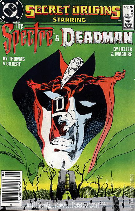 DEATH LIKE A CROWN Matson is on the roof of a tall building preparing to assassinate Kane, a former astronaut who is riding in a ticker-tape parade, via a high-powered rifle. Matson, however, shoots a member of Kane's security instead. Later, back at the League of Shadow's base, Sensei orders Matson's right hand chopped off by an axe as punishment but allows Matson a chance to redeem himself by finishing the job. Rama Kushna appears and Sensei orders everyone away, after which Sensei's body is vacated by Jonah, Rama's current agent, who has used Rama's gift for his own evil purposes. Rama gives Jonah one final chance to voluntarily undo his evil acts but Jonah is belligerent. Rama sends him to oblivion and instructs Taj-Ze, guardian of her temples, to summon her only willing agents, Vashnu and Maxwell Loomis. They are sent to America to find two men: one who wears a hook and another who wears death like a crown. At JFK Airport, they spot a poster for Deadman, an aerialist of Hills Brothers Circus and recognize him as one of their targets. At the circus, Boston Brand, a.k.a. Deadman, and Lorna discuss how attendance at the circus is at an all-time low. Vashnu and Loomis arrive under the pretense of looking for work and Loomis has an idea on how to drum up business. The next day, Kane is expected to announce his decision to run for President during an outdoor noon rally. Both Matson, now calling himself "Hook," and Boston arrive early to set up for their plans. During the speech, Hook prepares to shoot Kane when he is blocked by Deadman, sliding down a cable to land on the stage and invite Kane and his entourage to attend the circus tomorrow night. Kane ultimately accepts and Hook decides to try again there. The next night, the circus is packed and, as Boston prepares to perform, he feels a sudden chill (the presence of Rama though he is unaware of the reason). Rama speaks to Vashnu telling him what to do. Vashnu pleads for Boston's life but Rama is insistent. Loomis arrives stating that he has spotted the Hook and the two leave to confront him. But Vashnu uses his powers to make Hook believe he is really the Sensei and changes the orders from assassinating Kane to assassinating Deadman, which Hook does while Deadman is high in the air. Loomis and Vashnu are upset at Deadman's death but remain to guide his spirit. Boston's spirit realizes he has died and is visited by Rama Kushna. THE SECRET ORIGIN OF THE SPECTRE! February, 1940: Police Detective Jim Corrigan is preparing to attend the party of his soon-to-be fiancee, Clarice, when stoolie Louie Snipe arrives with a tip of a warehouse robbery this night. Jim intervenes capturing several of Gat Benson's gang. Jim calls Clarice from the station and Clarice leaves the party worried that Jim is injured. As they leave the station together, Gat and two of his henchmen capture them. Jim is shot, stuffed in a barrel which is then filled with cement, and dropped off a pier. Jim dies and arrives in Heaven but is denied entry as he was chosen to fight evil for eternity. Jim witnesses Clarice being injured and fatally shot and exacts his revenge on Gat and the henchmen discovering who had hired Gat in the process. He picks up Clarice only to discover his touch heals her wounds and she awakens. Jim convinces her it was just a dream. At her house, Jim pretends he no longer loves Clarice in order to distance her from him. He pleads to the voice that he be allowed eternal peace and the voice says it will consider his request but points out that Clarice is still in danger. Jim transforms into the Spectre's appearance and rushes to her aid. At the house, the Swami pretends to summon the spirit of Clarice's ancestor but the Spectre arrives and exposes the Swami as a hoax. In retaliation, Swami, who had hired Gat to kill Corrigan before he could reveal Swami as a hoax, shoots Clarice but time is frozen before the bullet can impact. The voice returns offering the Spectre a choice: eternal rest (but he cannot intervene in the bullet's path) or eternal mission of fighting evil. Spectre chooses to save Clarice and fight evil on Earth. He catches the bullet, traps the Swami's soul in a mirror and then shatters the mirror using the bullet. Spectre leaves as Clarice again mistakes the recent events as another dream.