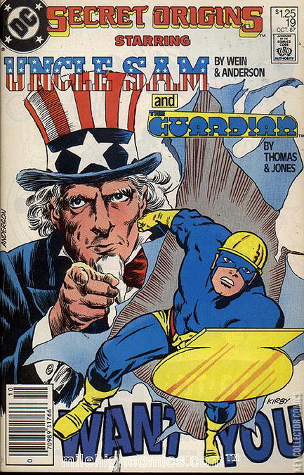 THE COMING OF UNCLE SAM At the onset of winter in 1777, near Valley Forge Pennsylvania, Revolutionary Patriot Samuel (last name unknown) was killed by Hessian mercenaries, whom he'd decoyed away from a crucial supply wagon train bound for Valley Forge. As he lay dying, Uncle Sam appeared to him, and had his own face and build, and asked him "Are you willing to give up Eternal Rest, to help me defend our country always?" And he was. He was seen again, at least five times, in 1812 on the high seas, in 1861 at Gettysburg, in 1865 at Appomattox, in 1898 on San Juan Hill, and in 1918 in France. Then in June 1940, Uncle Sam manifested for the second time in the 20th century, in the Midwestern town of Glen Valley, which was being taken over by the Black Legion (run by Herr Scar and his adjutant Snyle), with all but one local businessmen ready to capitulate. That one guy, Samuel (last name unknown) was approached by the living spirit of America and was, with a handshake, imbued with unimaginable power and invincibility. He would be as strong as America's belief in him, and in itself. That evening, outside of that town, a big-tent rally meeting was taking place, with local residents and dust bowl refugees, and unruly impromptu speaker Ezra Smith was rallying people to resist the Black Legion, who wore nazi-style uniforms with double-Xes in place of swastikas and all wore Hitler moustaches. The Black Legion had an underground fortress near town, and secretly had at least three panzers, with maybe 100 troops. A Black Legion hit team whacked old Ezra Smith and burned down his tent and sent his grandson, Buddy Smith, fleeing into the night, where he met up with Uncle Sam. The following afternoon, the gang actually invaded the town and started blowing stuff up, until Uncle Sam, and Buddy, confronted them. Unc single-handedly kicked the butts of most of Scar's men, and shook Scar himself out of his fleeing tank. Presumably Scar and his gang ended up in a Federal pen. THE SECRET ORIGIN OF THE GUARDIAN AND THE NEWSBOY LEGION One evening in early January 1942, in Suicide Slum, Metropolis, rookie cop Jim Harper gets beaten up by some thugs, and decides to take a new approach to crime-fighting. He breaks into a costume shop, assembles an "action outfit" that includes a sturdy shield and a crash helmet, leaves some money on the counter, and goes after the gang. He finds them in a pool parlor and smacks the hell out of all of them. He can't arrest them, so he ties them up and leaves them for the regular police. Also one of them drops his wallet, and Harper checks the serial numbers on some of his cash; it turns out to match the serial numbers from an earlier ransom payment. As he leaves the pool hall, the Guardian encounters a large glowing sphere of alien energy, and is pulled inside it, to have a completely different adventure in which he teams up with Ted 'Wildcat' Grant and Al 'the Atom' Pratt, in which they must fight and defeat a man well-known to all three of them: Nat Milligan aka Joe Morgan, who had, earlier in their lives, trained all three of these men as fighters. He also meets Alan 'Green Lantern' Scott, and is invited to join the All-Star Squadron. The next day, Harper arrests four quasi-delinquent, roller-skate-equipped young newspaper vendors, all orphans, pushed into crime by financial desperation, for shoplifting a hardware store. He accompanies them to their hearing, and asks the judge to keep them out of reform school, and remand them to his personal custody. He wants to try a different approach with these kids, and legally becomes their guardian. The boys don't exactly reform instantly, and soon a local lowlife, Frankie the Fence, uses them as a distraction for an armed robbery, in which a man is killed. This doesn't sit well with the boys, who go visit Frankie to tell him off, but Frankie decides to shut up these potential witnesses with a gun. The Guardian bursts into the room, and takes down the fence with one big roundhouse punch, then lets him get away, hoping he'll run back to his unknown boss. Frankie pulls himself together and runs to the waterfront, gets in a boat, and speeds away, pursued by the Guardian, who borrows an unguarded boat, and who is in return pursued by the Newsboys, who now are stymied; the Guardian took the last boat. They convert a wooden wagon into a makeshift rowboat, and follow along as best they can, figuring along the way that a nearby lighthouse is the likeliest place for a hideout. This turns out to be correct, and at the lighthouse the Guardian has run into trouble. Frankie's boss, Chips Carder, a smuggler, has managed to head-konk the Guardian unconscious. The boys show up; Guardian sees them and the bad guys don't. Guardian suggests, in language that only Big Words understands, that they should paint the lighthouse light red. They very quickly accomplish this, then charge inside to brawl with Chips and Frankie, while the red light above draws the Coast Guard, who arrive just in time to shoot Chips Carder as he draws a bead on the Guardian's back. While the USCG is sorting things out, the Guardian slips away, and motorboats back to shore. Before the first episode is even over, the boys begin to suspect that the Guardian is Jim Harper.