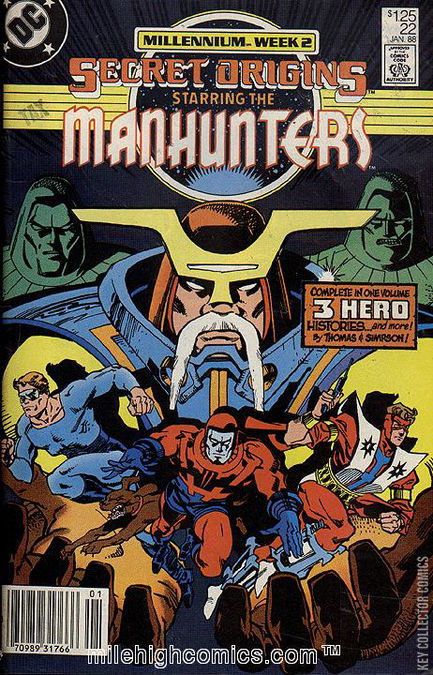 NO MAN ESCAPES THE MANHUNTERS! This issue focuses on the origin of the robotic Manhunter Cult, beginning with their creation at the hands of the Guardians of the Universe. It shows their conflict with the Guardians' rigid structure and their ultimate rebellion. To combat the renegade Manhunters, the Guardians created an agency of sentient peace-keeping officers which came to be known as the Green Lantern Corps. Through the centuries, the Manhunters have used sleeper agents to carry on their work some of whom have even adopted the name "Manhunter" such as Dan Richards, Paul Kirk and Mark Shaw.