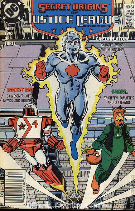 CAPTAIN ATOM: YESTERDAYS ONCE MORE In Las Vegas, Miss Del Gado host the meeting of the "Friends of Captain Atom"—people who met the superhero Captain Atom when his very existence was a secret unheard of by the rest of the world, and have since sworn to secrecy until now. Each member share their unique tales of the hero. General Datko witnessed the birth of Captain Atom when he was at Cape Kennedy overseeing the launch of a Atlas rocket. A highly skilled specialist was working inside the rocket and was accidentally trapped inside due to a dropped screwdriver. The man was launched into space where the rocket exploded which transformed the man into Captain Atom. Buddy Larson recalled having met Captain Atom when he was a terminally ill young child. The Captain took Buddy in a jaunt to outer space and visiting the solar system's asteroid belt where Buddy's illness is cured from being expose to one of the asteroids' strange elements. Husband and wife Harry and Matilda Denison were once rescued by the Captain during their wedding anniversary when they were accidentally sent adrift in a naval nuclear testing area. Former Soviet cosmonaut Uri Voskof was saved by the Captain from burning up in his space capsule during his reentry back to Earth where Captain Atom safely maneuvered the capsule onto a Russian ship. The rescue was silenced by the Soviet government, who refused to acknowledge an American superhero had saved the life of their cosmonaut. After the group finished their stories, Miss Del Gado consult with General Wade Eiling and Doctor Megala on the "Friends of Captain Atom," who are actually paid actors preparing for their roles in an Captain Atom TV documentary. Eiling find that there are several flaws and inconsistencies in the actors' scripts, and he wants several changes to be made to ensure the Captain Atom cover story is legit. ROCKET RED: DID YOU HEAR THAT ONE...? G'NORT: THE SECRET ORIGIN OF G'NORT In the crowded city of Squashedbush, G'nelson and G'nancy Gneesmacher had a son they called G'nort. As a baby, G'nort's wellfare was a stressful task for his parents. Occasionally, his mother would try to calm the boy by dropping him from the roof of the house. Years passed, G'nort grew up and started attending school, where he only listened when the teacher spoke about the legendary Green Lantern G'newmann G'noggs (who, according to G'nelson, was a distant relative of the Gneesmachers). G'nort's grades were disappointing, and his parents were ashamed of him. In time, G'nort left the house, and his parents didn't even notice. G'nort wandered alone, until he found the Green Lantern G'newmann G'noggs. G'newman, instead of a distant relative, turned out to be G'nort's uncle, and he tried to teach his nephew about the Green Lanterns. By the time G'nort was twenty years olg, G'newmann spoke to the Guardians to admit G'nort into the Corps. After lots of insistence, the Guardians finally accepted G'newmann's request for G'nort. G'nort quit his job as pizza deliverer, cut his hair, and after fourteen years of training, he became a Green Lantern, assigned to a space sector that had no life forms larger than an amoeba.
