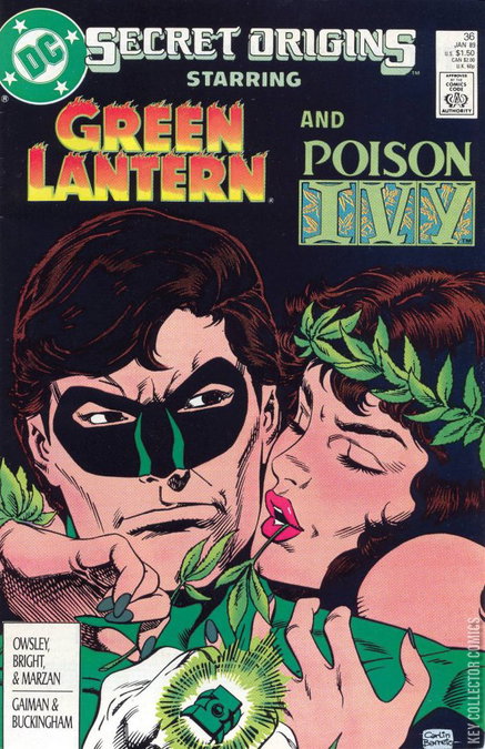 THE SECRET ORIGIN OF GREEN LANTERN Chip, a young boy with a years-long obsession with Green Lantern, runs an ad to find a test pilot for his agency. Hal Jordan finds the ad and drives from Detroit. When he reaches Chip's address, the boy recognizes Hal as Green Lantern. Hal denies it and gets back in his car, but Chip catches up to him. Cornered in the L.A. traffic, Hal doesn't see any other choice but to indulge his fan. Hal gives him a ring duplicate and they fly over Los Angeles, while Hal narrates to Chip how he became a Green Lantern. He then takes him to the desolated Oa, where he shows him the destroyed Central Power Battery. They soon encounter a group of scavengers raiding the remains of the Citadel, and they take them out of the planet. Afterward, they return to Earth. After thinking about it for some time, Hal accepts Chip's job offer but urges him to keep his secret identity. Chip calls his associates and introduces Hal to the Elite Design Consultants, a.k.a. the "Gremlins." A PIECE OF THE PIE Tom Kalmaku tells his kids the story of how he met Green Lantern. Years ago, Tom's father and an associate, Jimmy Dawes, found a gold mine. Both of them made a map and split it in half, each other keeping a part. However, Tom's father died shortly of a decease. Tom decided to follow Jimmy's trail and find him in Coast City, while he also worked as a mechanic in Ferris Aircraft. There, a couple of thugs assaulted him and stole the map. In the middle of that incident Tom met Hal Jordan, who was a bit cold at first, giving him the nickname "Pieface." Green Lantern then appeared to Tom and offered his help, probing his mind to rebuild the stolen map from his memories. They followed the map and found the thugs in the gold mine, where Tom deduced Green Lantern's secret identity was Hal Jordan. From that point, Tom became Green Lantern's confidant, keeping track of their adventures together. PAVANE An inspector visits Pamela Isley's prison cell to interview her about her past. She tells him the story of her lonely childhood, and how she had studied plants with Jason Woodrue. Afterwards she started seeing Batman's face in the news, and had fallen in love with him. She threw together a costume and a name for herself, Poison Ivy, and started her life of crime for his attention. Over the course of these interviews, Poison Ivy gradually attempts to seduce the inspector. But in the end he concludes in his report that she should be taken to Arkham Asylum, as Poison Ivy pleads for her freedom.