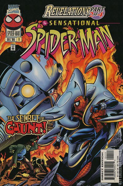 Deadly Diversions (Revelations, Part 2) starring Spider-Man [Ben Reilly], Peter Parker, Gaunt, Mary Jane Parker, Anna Watson, J. Jonah Jameson, Joe (Robbie) Robertson, Flash Thompson, Betty Brant, and Arthur Stacy. Gaunt, under orders from the mysterious mastermind, attacks Ben and Peter; Mary Jane goes into labor.Note: While Norman Osborn has a speaking role, his face is kept hidden throughout the issue.