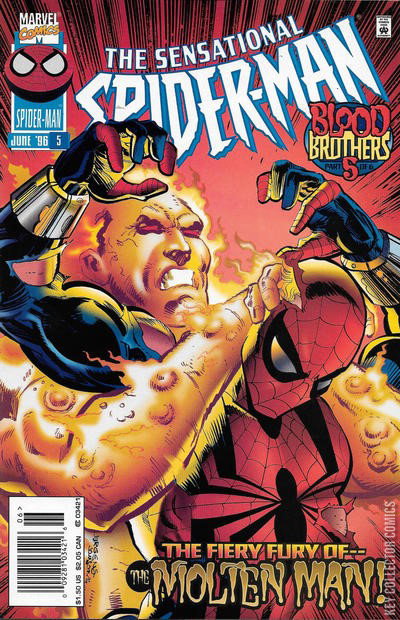 'Blood Brothers: Part 5 of 6 - Collisions with the Past' Starring Spider-Man [Ben Reilly], Peter Parker, Jessica Carradine, Shirley Washington, Desiree Winthrop, Trish Kowalski, Liz Allan Osborn, Normie Osborn, Molten Man [Mark Raxton], Seward Trainer, and Gaunt [Professor Mendel Stromm]. Spider-Man and Peter Parker begin closing in on the enigmatic figure who's been messing up their lives--but Spidey's old foe, the Molten Man, is on the villain's trail as well. Blood Brothers part 5