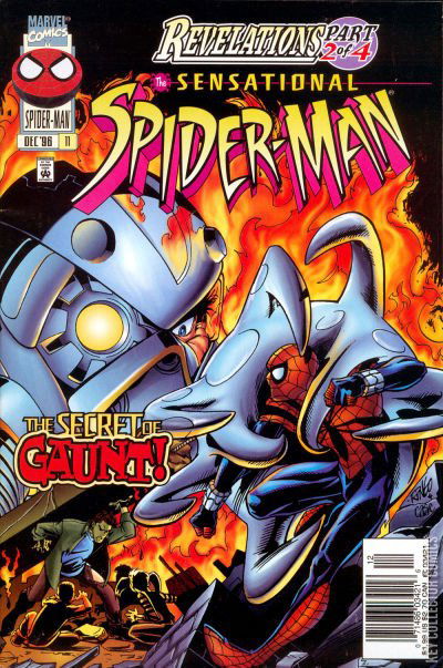 Deadly Diversions (Revelations, Part 2) starring Spider-Man [Ben Reilly], Peter Parker, Gaunt, Mary Jane Parker, Anna Watson, J. Jonah Jameson, Joe (Robbie) Robertson, Flash Thompson, Betty Brant, and Arthur Stacy. Gaunt, under orders from the mysterious mastermind, attacks Ben and Peter; Mary Jane goes into labor.Note: While Norman Osborn has a speaking role, his face is kept hidden throughout the issue.