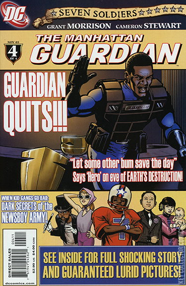 PART FOUR: "SEX SECRETS OF THE NEWSBOY ARMY!" More must-see mysteries of the SEVEN SOLDIERS saga unfold as the GUARDIAN miniseries finale builds toward the epic conclusion in SEVEN SOLDIERS #1! Is a broken, embittered Jake Jordan ready for "Sex Secrets of the Newsboy Army"! Who were Captain 7, Kid Scarface, Baby Brains, Ali-Ka-Zoom, Chop Suzi, Li'l Hollywood and Millions the Mystery Mutt? What was the vow they made as children outside the United Nations building? What did they do that was so wrong, and why will the entire world suffer in an alien hell if the Guardian makes the wrong decision this time?