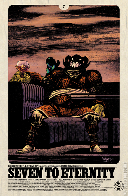 Now suffering from the aftermath of the sentient swamp, The Mosak follow Adam to Jevalia’s childhood home to discover a trampled paradise, the bled souls of its heroes, and a fetid industry thirsting for more. SEVEN TO ETERNITY is proud to welcome superstar JAMES HARREN as a special guest artist to unveil the heights of heroism in a world awash with corruption.