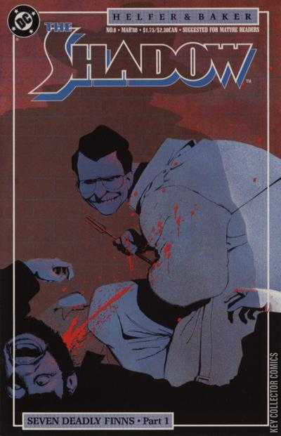 Seeing Red, script by Andy Helfer, art by Kyle Baker; A serial killer is on the loose killing convicted felons with a fork; When one of the Finn brothers of the underworld gets stabbed in the neck, The Shadow sympathizes with the killer; Seven Deadly Finns Part 1.