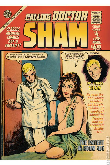 Resident irreverent comic guru, Tim Fuller, returns with Sham Comics #4! This month, Sham turns its caustic eye on the world of medicine in this hilarious send up Golden Age cheese. Paging Doctor Studly Sham! Paging Doctor Studly Sham! Paging... ahhh, forget it.