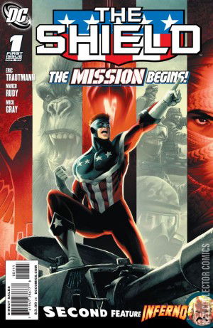 Spinning out of August's "Red Circle" event from superstar writer J. Michael Straczynski comes the new ongoing adventures of the patriotic Shield and the mysterious man on the run, Inferno! Eric Trautmann (CHECKMATE) and Marco Rudy (FINAL CRISIS) take Lt. Joe Higgins, a.k.a. The Shield, into the hotspots civilians dare not go. His first mission takes The Shield to the razed country of Bialya, destroyed by the rage of Black Adam in 52. Something lurks in the mountains beyond militia activity, and The Shield must investigate! Plus, Inferno stars in a fast-paced co-feature from writer Brandon Jerwa (G.I. Joe) and artist Greg Scott (GOTHAM CENTRAL)! Who is Inferno, and why is he being pursued by the Dark Men? He'd better find out fast because Green Arrow and Black Canary have questions of their own for the new hero!