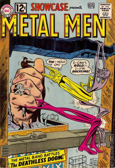 THE DEATHLESS DOOM! Colonel Henry Casper has contacted the Metal Men to find chemist Ramsey Norton who recently disappeared from his lab. As soon as they set their Rocket Disc on the roof of his lab building, a mammoth hand reaches through the ceiling and grabs Will Magnus and Platinum. Magnus orders the remaining robots to get Casper to safety at a nearby construction site and the duo are dragged inside. Platinum refuses to user her abilities to escape and abandon Magnus and they soon discover that the hand is Norton's—he has grown to several times his original size. As he lay dying, he explains how he accidentally created the entity Chemo while trying to find a cure for all disease. Chemo was originally an inert plastic vessel that stored all of his failed experiments: chemicals were poured into the mold until it was full and the container spewed chemicals onto Ramsey and started growing. It only escaped moments prior to the team's arrival and Ramsey dies as soon as he finishes his tale. The team reunites on the adjacent scaffolding, only to have Chemo appear and attack them. Platinum forms a bridge for them to run away but she doesn't have time to save herself. or Lead. They fly away in their Rocket Disc and loop around after Chemo melts a hole into the ground. Iron transforms into a crane and Magnus retrieves the inert bodies of their colleagues. Back at Magnus Labs, he attempts to restore them and the other heroes go back to stop Chemo: Mercury insists on working alone and Gold, Iron, and Tin team up. Chemo is wreaking havoc in the city—melting train tracks, police cars, and all manner of infrastructure in a seemingly mindless spree. It quickly melts Mercury into globs and melts Tin when he tries to form a large can to contain it. Gold and Iron attack and Chemo's coating causes them to tarnish and rust respectively. Magnus has only been able to revive Platinum but the duo return to the battle field to find Chemo cutting the top off a skyscraper. They push him off with their Rocket Disc only to have that rapidly melt as well. They lead the chemical monstrosity into a hole that has been burned into the ground, where it is captured among two competing natural gas jets, trapping it motionless. Tina brings them back to the surface where they gather up the bits of their friends and Magnus takes them back to the lab for reconstruction.