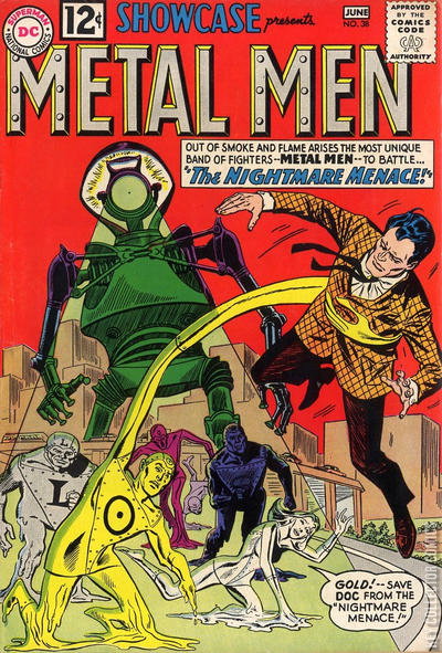THE NIGHTMARE MENACE! After being destroyed by Manta, the world has become obsessed with the Metal Men. The news spreads to the Kremlin, where ex-Nazi scientist Von Vroom who is tasked with coming up with a superior weapon. In Washington, D.C., Col. Henry Casper is ordered to find Dr. Will Magnus and convince him to build new heroes before the public finds out that they were robots and that they were destroyed in their first outing. The scientist is depressed from having lost his companions but ultimately agrees and sets out rebuilding the team purely for a public relations event, then to be shuttered away in Magnus Labs. These new creations lack the personalities of his first generation but they will suffice for the awards ceremony. Von Vroom is at the Washington Monument and debuts his huge Nightmare Menace: a mammoth robot with a death ray on top. Magnus instructs Platinum to ensnare the villain but she ends up twisting around her teammates instead. Iron tosses Gold into a fighter jet attempting to secure the area and he accidentally melts Lead. After humiliating the heroes, the Menace depowers the fighter jets in mid-air and then rapidly swirls to burrow into the Earth and disappear. The crowd jeers the Metal Men for being failures and Magnus smelts them in his lab. He looks back at his notes and notices that an intense aurora borealis occurred as he built the last robots. Casper and Magnus retrieve the old bodies of the Metal Men, still lying where they were destroyed by Manta and he restarts them to find they have the personalities and competence from before. Tin immediately wants to prove himself a hero, Lead boasts how strong he is, Mercury reminds everyone that he is unique, Lead offers to shield everyone from harm, Gold takes charge, and Platinum embraces Magnus. He informs them that they now have to stop the villain and prove themselves to the world. They attend a world's fair, hoping to draw out the Nightmare Menace again and find a booing public. While awaiting an attack, they assist a lost girl in finding her parents and give a few patrons stuck on a ride a golden ladder to the ground. As some members of the public slowly change their opinion, the Menace emerges from below the ground and starts to melt more jets from a demonstration. Platinum turns into a net and Lead scoops up the planes before they crash. The split into teams but prove ineffectual at stopping the Menace: Tin hurls Gold into the larger robot's head and knocks it to the ground, only to find that a smaller Menace rests inside! Mercury performs a similar trick, smashing the robot only to have a third body emerge. Iron melts Lead into a ball and hurls it at this version of the Menace, only to have an even smaller version pop out. The team regroups and are melted by the Menace—Gold manages to shove Magnus to safety and the last of her strength, Platinum lunges at the robot and rips him in half, only to have a human-sized Menace leap out to attack Magnus. Magnus leads the villain onto a spinning wheel ride and the robot becomes disoriented. As the ride comes to completion, the frame cracks open and a dizzy Von Vroom is inside, reeling from the fight. Magnus apprehends him and reforms the Metal Men's bodies to fight again.