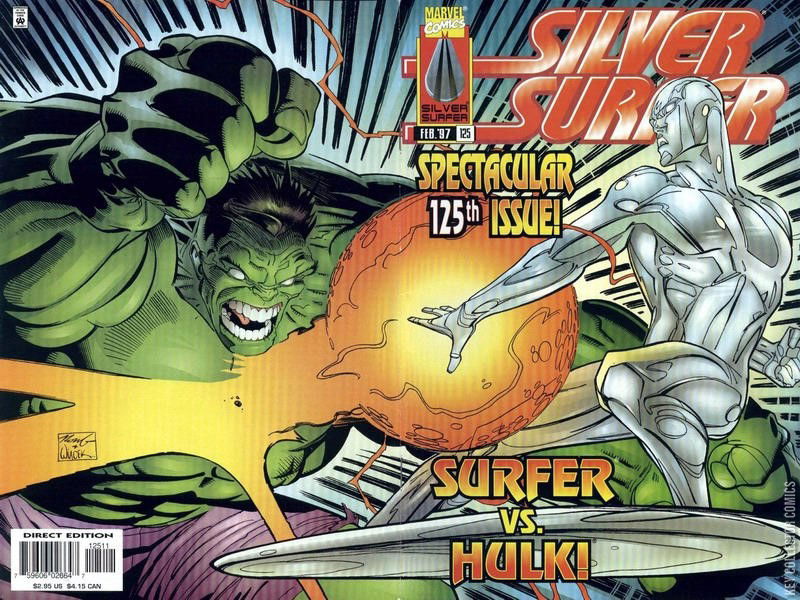 The Heart of the Beast The Silver Surfer returns to Earth and finds the Hulk on a rampage. The Surfer tries to talk some sense in him and resume their friendship, but the Hulk won't listen. The Hulk tells him Banner is dead (from Onslaught) and attacks the Surfer, wanting to be left alone. The Surfer uses his power to remove the radiation from his blood and revert him to Banner as he had done in the past. It fails and the Surfer realizes that Banner must be gone and the Hulk is telling the truth. The Hulk tries to escape. The Surfer catches up with the Hulk and continues to try to speak with him. He soon realizes the Hulk is rampaging because he is scared. He will soon die without Banner. The Hulk leaves and the Surfer decides to leave him in peace. That is when Doctor Strange shows up. Home For The Holidays The Silver Surfer saves a girl in the Bronx from armed gunmen. She soon reveals that those were cops shooting at her and she is wanted for killing her father. She had done it because he always beat her mother and her mother would not even speak with her. The Surfer tells her that he is going to bring her to the authorities but she has one request first. The Surfer obliges and takes her to her mother. They reconcile and the mother doesn't want her daughter to go back to the institute, but she has to go. But when she looks out the window, the Silver Surfer has left.