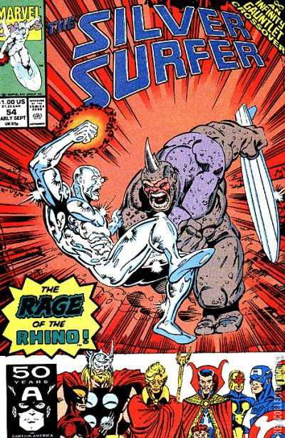 "Cages" While Adam Warlock discusses his plans with the world's heroes, the Surfer decides to get away a little bit. The city is in a state of destruction. He flies to Central Park to relax and enjoy nature. He soon finds that a tiger is on the loose. He goes to examine where the animal came from and finds the Central Park Zoo.He soon finds that the animals are being released by the Rhino. He tells him to stop and that it is dangerous to let them loose. Rhino just wants them to be free before the world ends and possibly create a little chaos.They begin to battle and soon it is revealed that Rhino is no physical match for the Surfer. They stop fighting when they hear a gunshot.They find a local police officer has shot the tiger. Rhino is very sad about this and realizes that it is all his fault. Surfer uses his Power Cosmic to revive the tiger. He and the Surfer reconcile and put all the animals back in their cages. Surfer tells him he hopes their next meeting will be pleasant but the Rhino says he doubts it.Back at Avenger's Mansion the Surfer runs into the Hulk, who is suddenly interested in defeating Thanos.