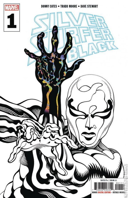 BLACK, PART 1 OF 5 Spinning out of GUARDIANS OF THE GALAXY #1, almost the entire galaxy’s defenders have been blown through a black hole, including the Silver Surfer! But the story doesn’t end there… In order to fight back the oblivion, Surfer will have to fight to save his own soul and not lose himself to the void. Follow the Sentinel of the Spaceways on a journey that will change him forever! From superstars Donny Cates (VENOM, GUARDIANS OF THE GALAXY) and Tradd Moore (ALL-NEW GHOST RIDER, VENOM) !