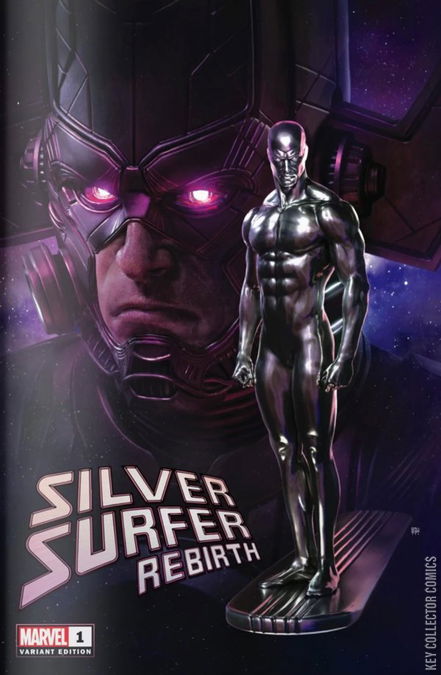 MARVELS THEY’RE BACK! No, we don’t mean the guys on the cover… We’re talking about legendary creators Ron Marz and Ron Lim returning to tell a story set during their fan-favorite run of SILVER SURFER! Someone has stolen the Reality Gem, an object that allows the user to fulfill any wish no matter the consequences! But whoever has taken it is doing things like bringing back the dead hero Captain Mar-Vell. It’s up to Silver Surfer to team up with the least likely of allies, Thanos, to find the Gem and restore reality to its proper form!