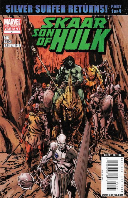 The soothsayers sing: One day, green-hued giants will clash on the broken battlefields of savage Sakaar. One day the son will confront the father who abandoned him to monsters and madmen. But before Skaar can meet the Hulk, he must survive today's terrible clash. And even with all his rage and strength, what hope can he have against the return of the SILVER SAVAGE? The Silver Surfer returns to Sakaar as a new story-arc begins!