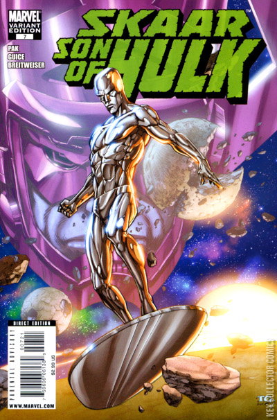 The soothsayers sing: One day, green-hued giants will clash on the broken battlefields of savage Sakaar. One day the son will confront the father who abandoned him to monsters and madmen. But before Skaar can meet the Hulk, he must survive today's terrible clash. And even with all his rage and strength, what hope can he have against the return of the SILVER SAVAGE? The Silver Surfer returns to Sakaar as a new story-arc begins!