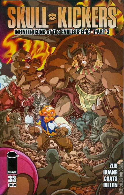'INFINITE ICONS OF THE ENDLESS EPIC,' Part Three Double, double, toil, and trouble...heroes burn and dimensions bubble! This issue has the second of two connecting gatefold covers by EDWIN HUANG & JEFF 'CHAMBA' CRUZ. Get this one and the previous month's issue to put together the ultimate SKULLKICKERS battle panorama!