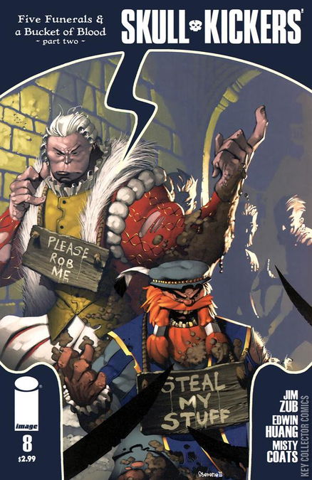 'FIVE FUNERALS AND A BUCKET OF BLOOD,' Part Two Weaponless, weary and wanted by the law! The Skullkickers' heroic reputation has flip-flopped in a whirlwind of faerie magic and bloody bodies. Who's responsible and how bad are they gonna get thumped by everyone's favorite monster mashers? Image's hit action-comedy series is on time and kick ass - Believe it!